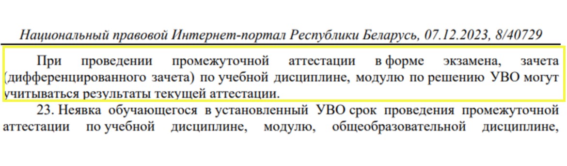 В белорусских колледжах и вузах автоматом можно получить не только 9 и 10 баллов. Часто преподаватели в конце семестров подводят итоги и предлагают оценку, на которую наработал студент за полгода: от 4 и выше. Если учащийся согласен, сдавать экзамен не нужно: удовлетворительна отметка в кармане. Тот, кто считает, что заслуживает оценку выше, отправляется на аттестацию в установленные сроки.
