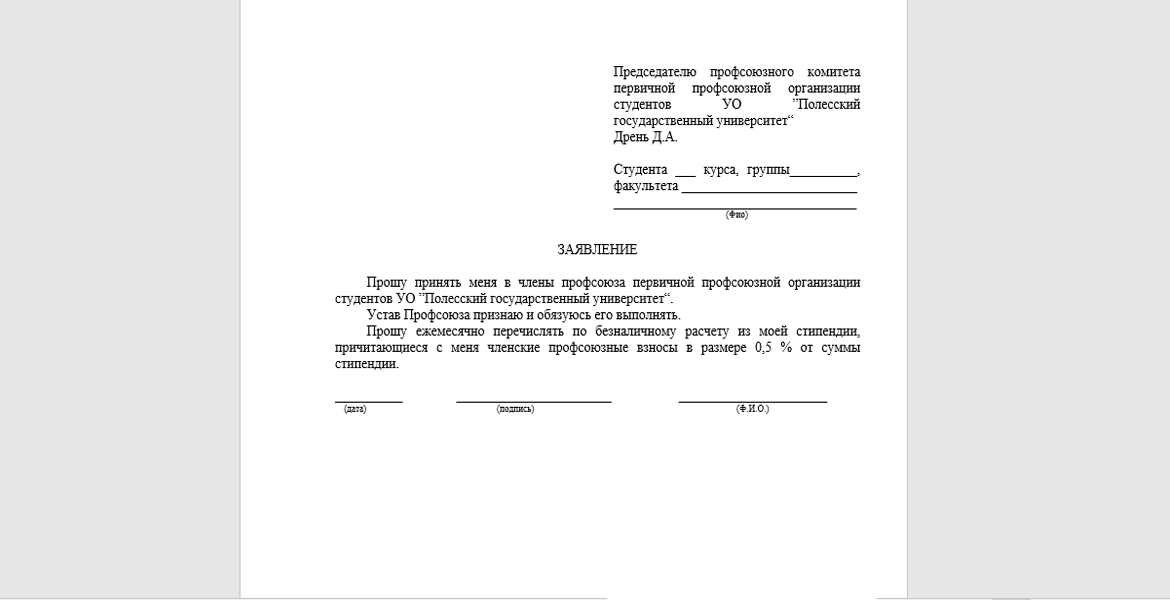 После рассмотрения заявления и положительного ответа студентам оформляют профсоюзные билеты (нужна будет фотография 3х4) и учетные карточки. По окончании учебы или в случае отчисления нужно сняться с профсоюзного учета.