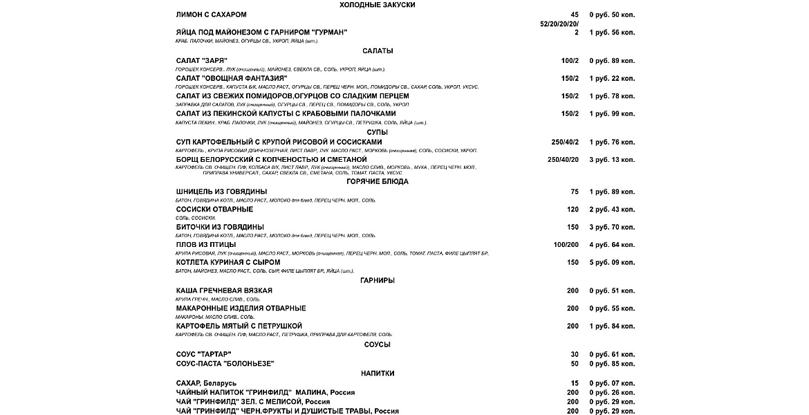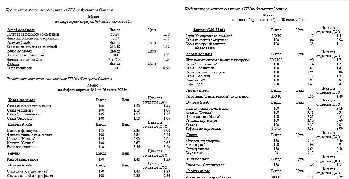 Меню в ГГУ им. Ф. Скорины (кафетерий, столовая и буфет)