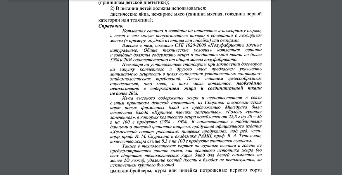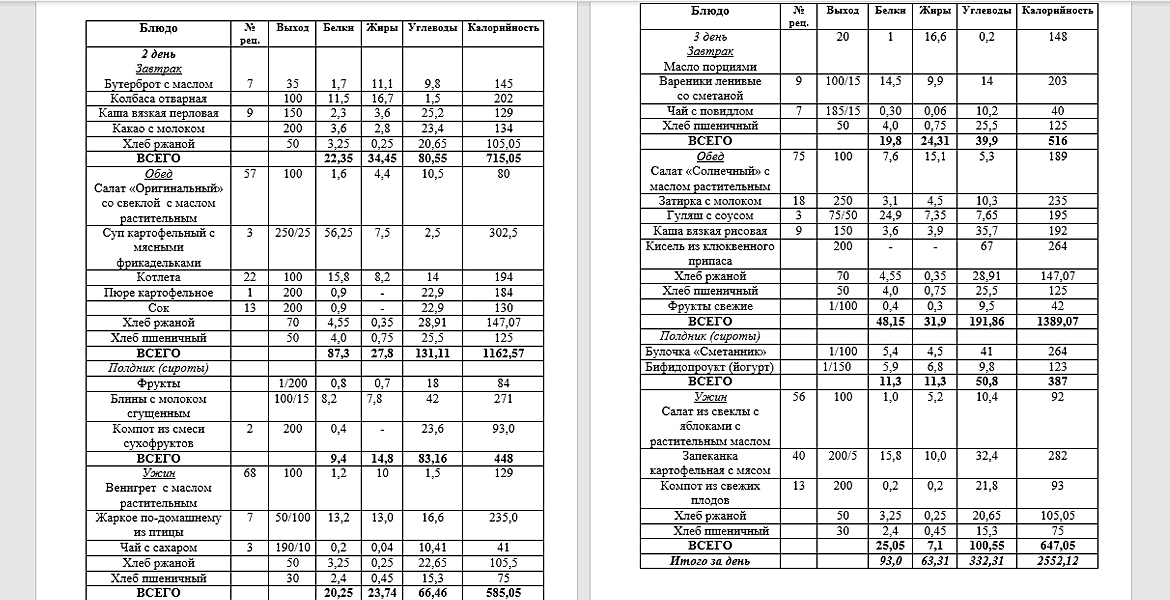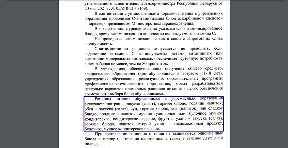 Также в положении прописано, из чего состоит каждый приём пищи: