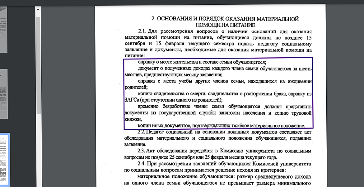 Студентам вузов повезло меньше: бесплатного питания для них не предусмотрено, однако учащиеся могут рассчитывать на локальные льготы, то есть получить материальную помощь на питание по усмотрению вуза. На частичную компенсацию расходов могут рассчитывать дети-сироты и дети, оставшиеся без попечения родителей, а также остальные учащиеся дневной формы, которые находятся в тяжёлом материальном положении. Кроме заявления студенту потребуется доказать своё положение – по размеру среднедушевого дохода на одного члена семьи, не превышающего размера минимального потребительского бюджета на семью из четырёх человек.