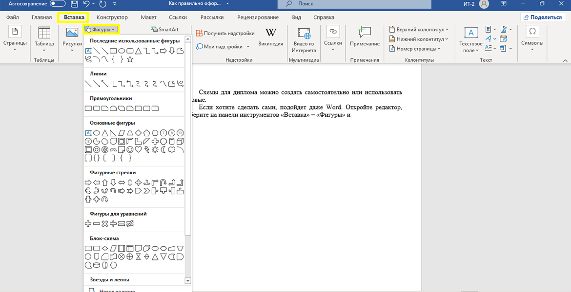 Если хотите сделать сами, подойдет даже Word. Откройте редактор, выберите на панели инструментов «Вставка» – «Фигуры» и, выбирая предложенные объекты, создайте графику.
