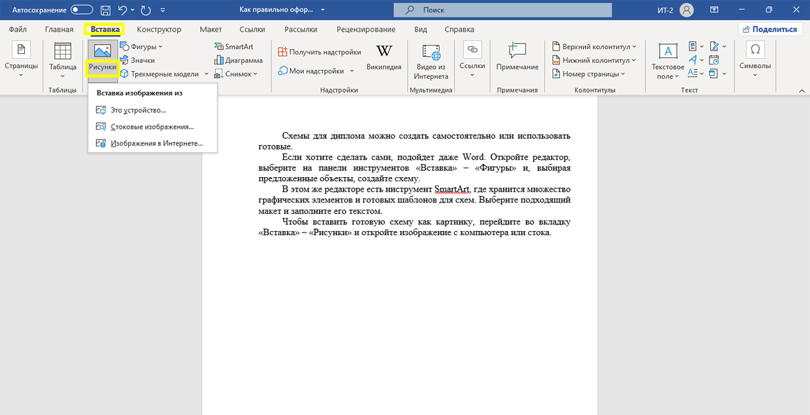 Чтобы вставить готовую картинку, перейдите во вкладку «Вставка» – «Рисунки» и откройте изображение с компьютера или стока.