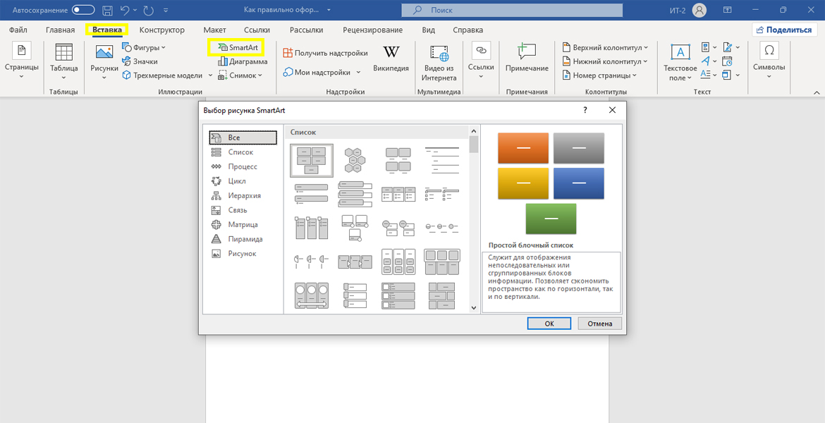 В этом же редакторе есть инструмент SmartArt, где хранится множество графических элементов и готовых шаблонов для схем. Выберите подходящий макет и заполните его текстом.