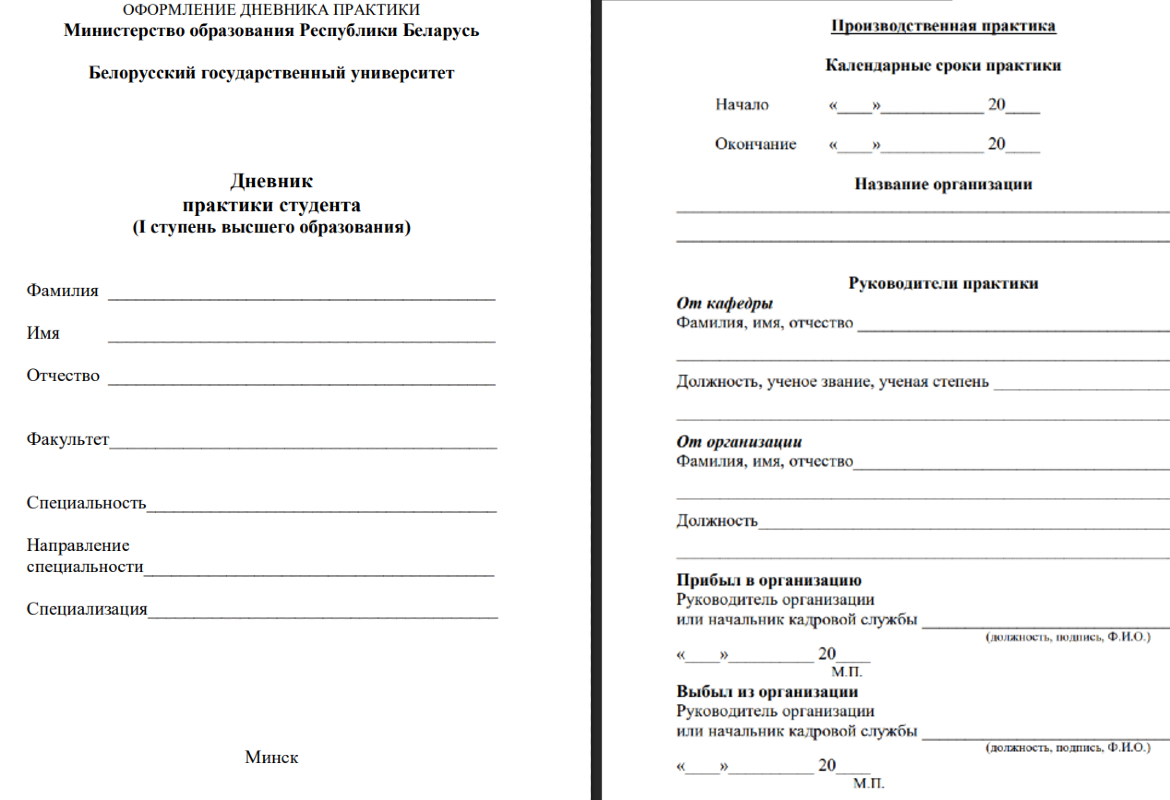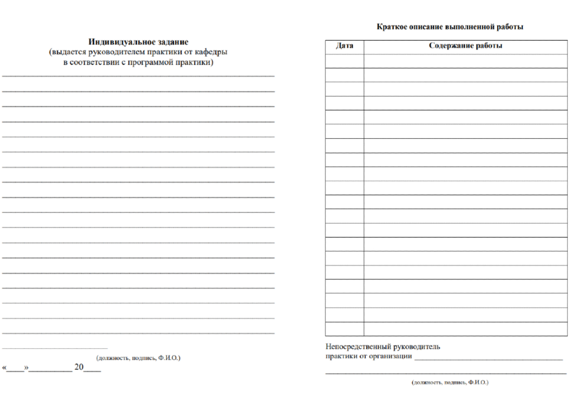 У дневника собственная структура. Обычно он состоит из титульного листа, индивидуального задания, кратких ежедневных записей о проделанной работе и отзыва руководителя практики от организации.