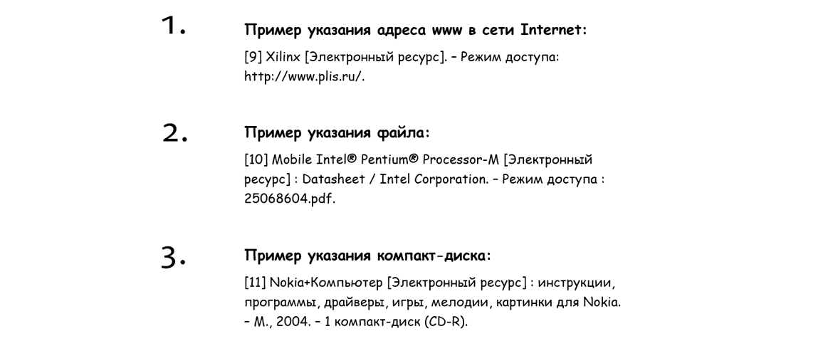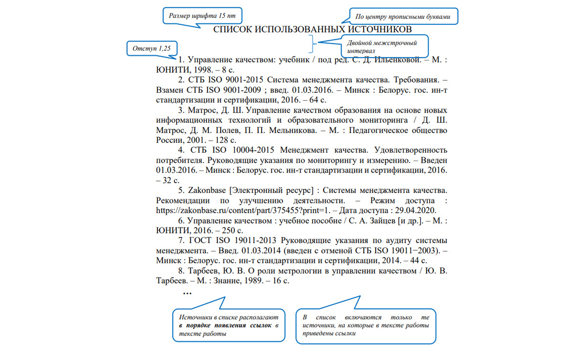 Библиографический список диплома должен включать от 35 до 50 наименований, для перечислений используется сквозная нумерация источников – от начала и до конца списка. Номер источника записывается арабскими цифрами, ставится перед записью и отделяется точкой. Общие требования к оформлению библиографического описания в списке литературы регулирует ГОСТ 7.1 – 2003. Этот ГОСТ устанавливает не только порядок записи источников, но и требования к их структуре, знакам препинания и последовательности элементов: