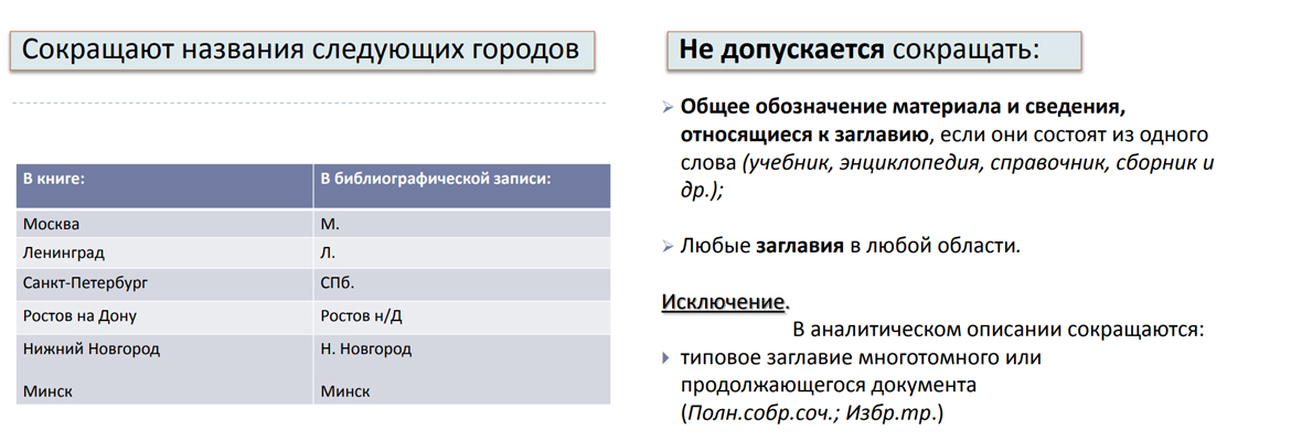 При необходимости допускается сокращение слов и словосочетаний, пропуск части элемента. Такие сокращения должны соответствовать установленным стандартам и быть однозначно понятными для читателя. Числительные в описании приводятся в том формате, в котором они указаны в источнике: римскими или арабскими цифрами либо в словесной форме.