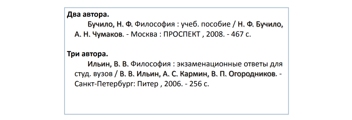 В список литературы входят изученные, упоминаемые и цитируемые источники, то есть все ресурсы, которые автор использовал при написании диплома, включая электронные. Оформляются использованные источники в виде библиографической записи, состоящей из заголовка и библиографического описания. Есть 2 способа составления записи: под заголовком и под заглавием. Если авторов не менее трех – библиографическую запись составляют под заголовком, содержащим имя лица, если четыре и более – под заглавием. Примеры: